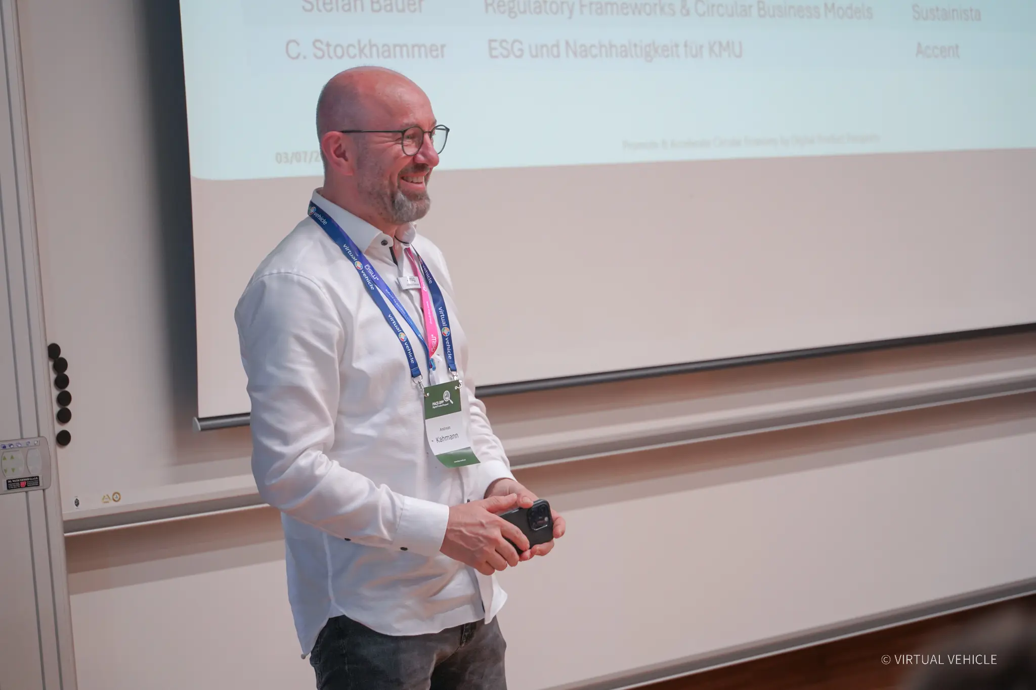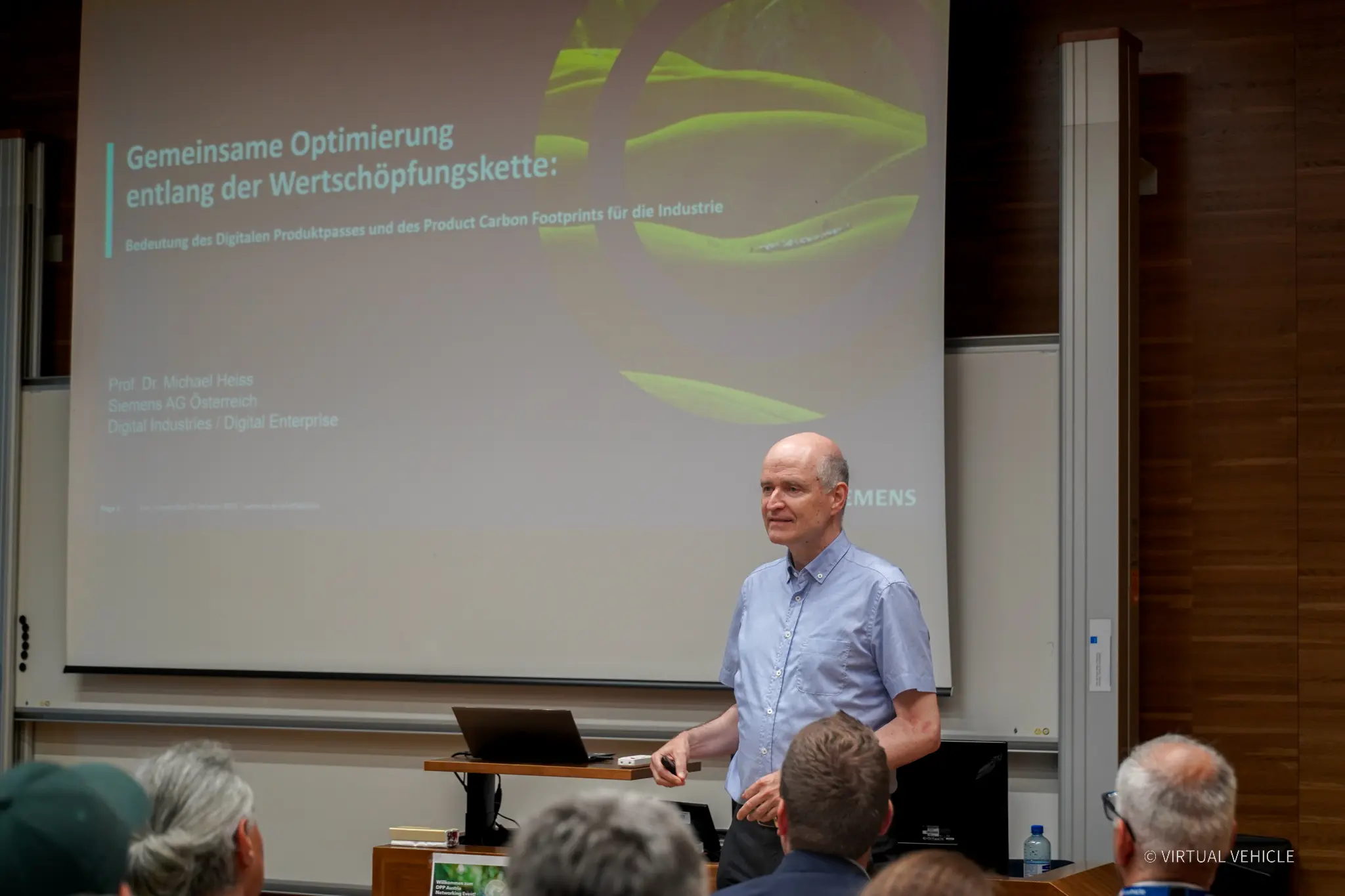 Die Keynote hielt Prof. Dr. Michael Heiss, Principal Consultant der Digital Enterprise Siemens AG Österreich, in der er einen Einblick sowie Ausblick auf die industrielle Perspektive zum Thema DPP gab.